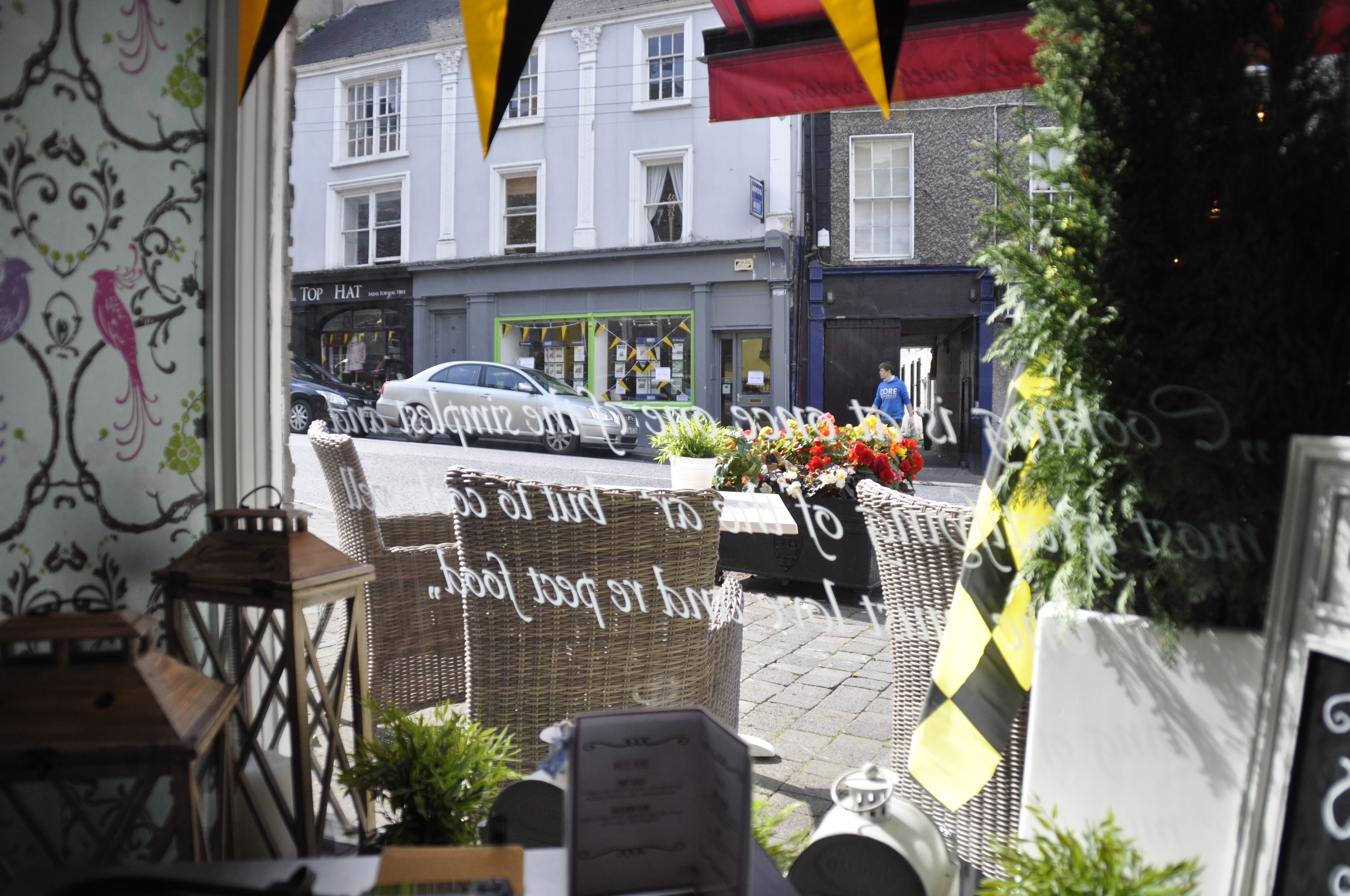 Ich sitze in einem kleinen Cafe und schaue auf die Straße.