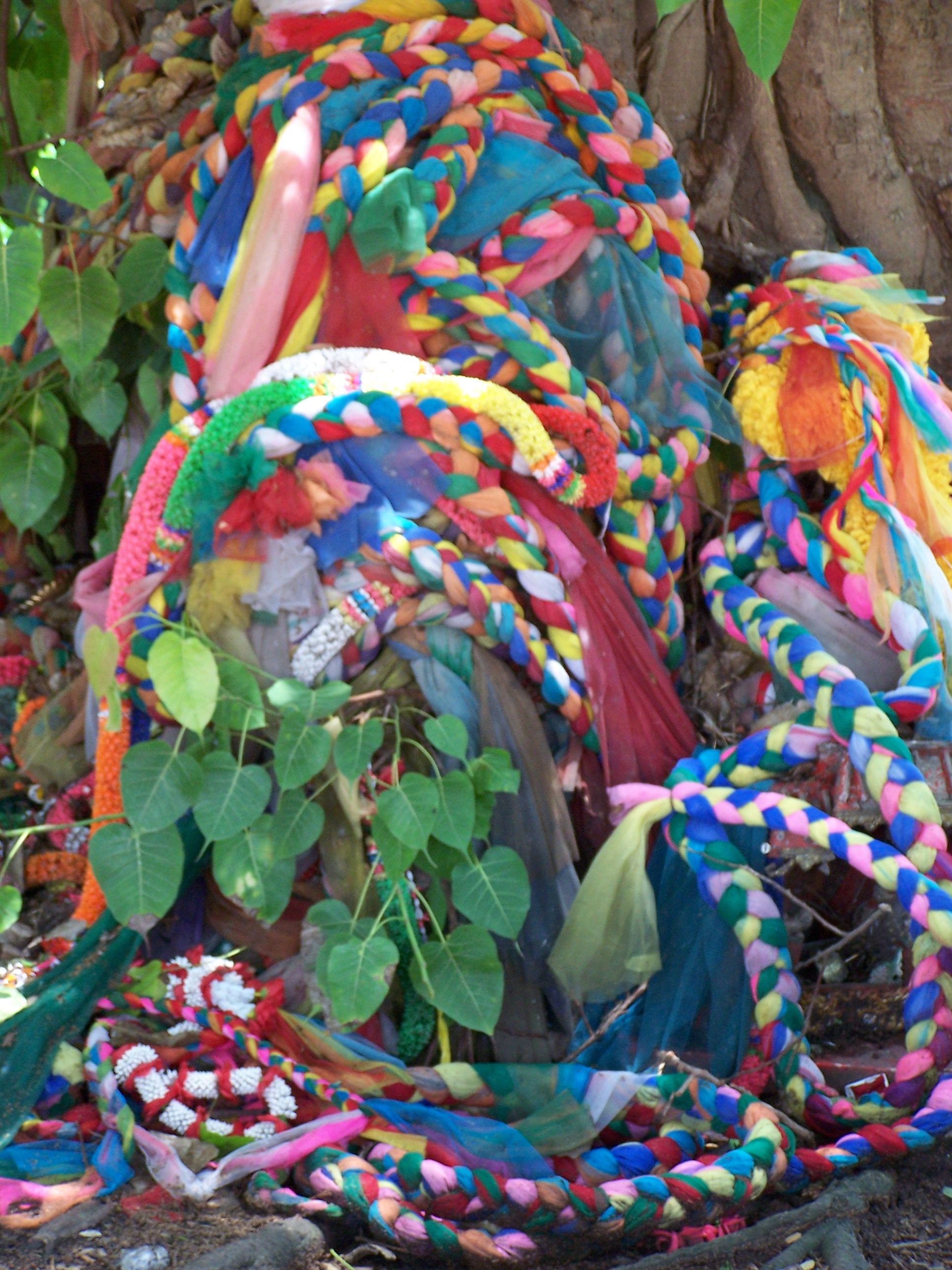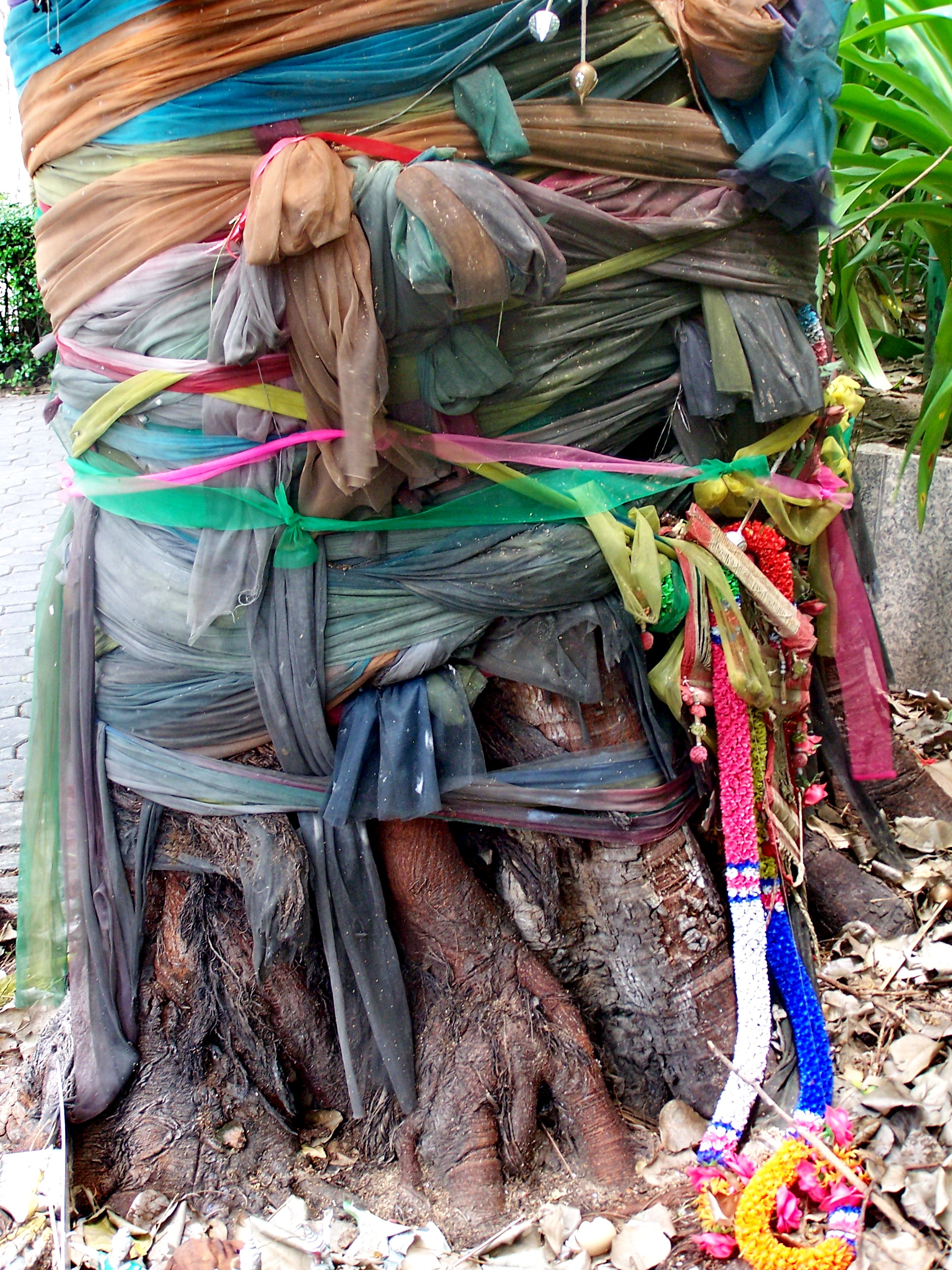 Wir müssen uns allerdings vorstellen, dass jeder gläubige Thai diesem Baum ein Stoffband mitbringt und es um dessen Stamm schlingt.