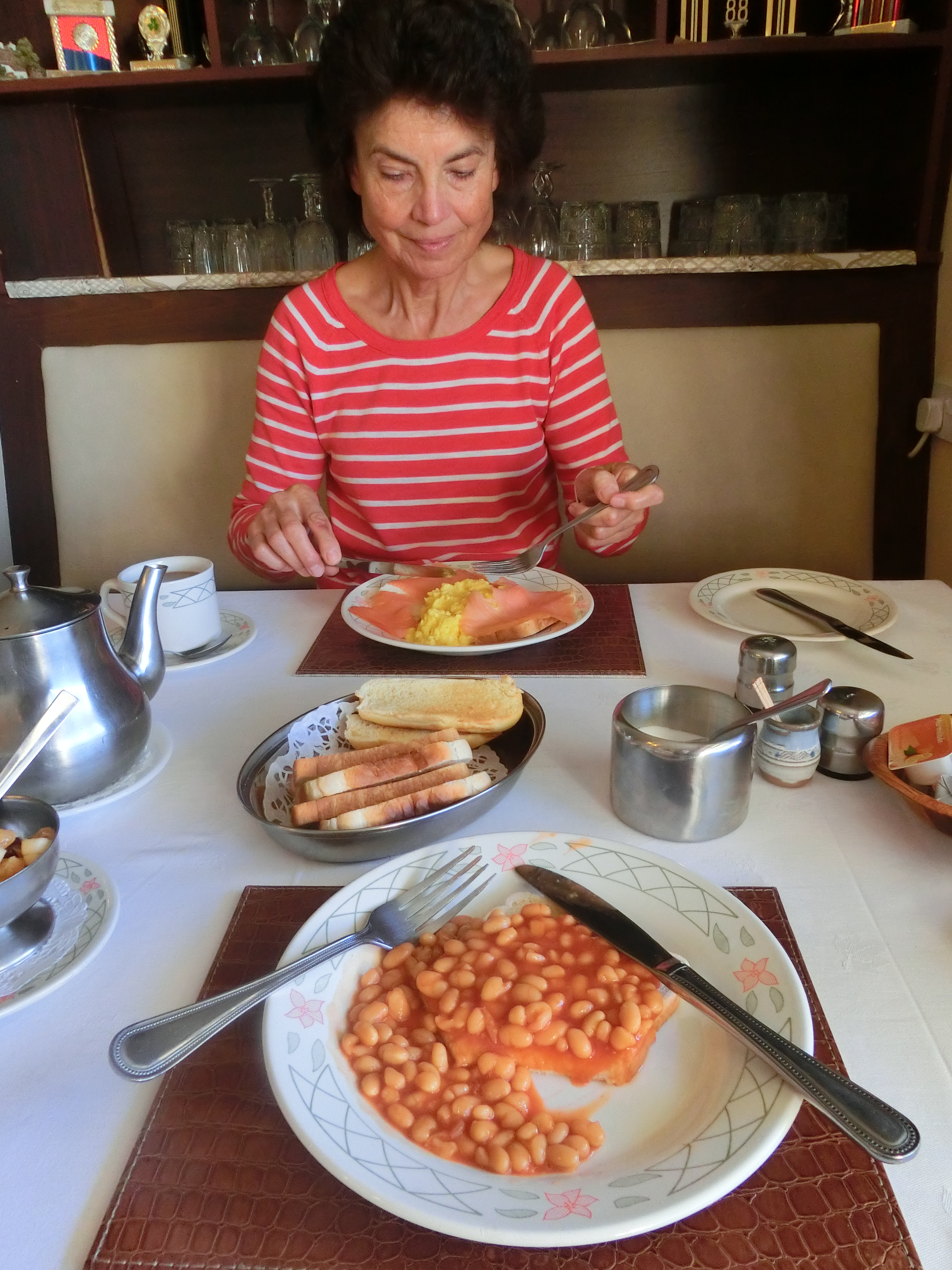 Mary hat uns das Frühstück bereitet, typisch irish, viel Wurst, eggs and ham, Bohnen, anschließend ein Marmeladebrötchen, einen Kaffee und noch etwas Orangensaft.