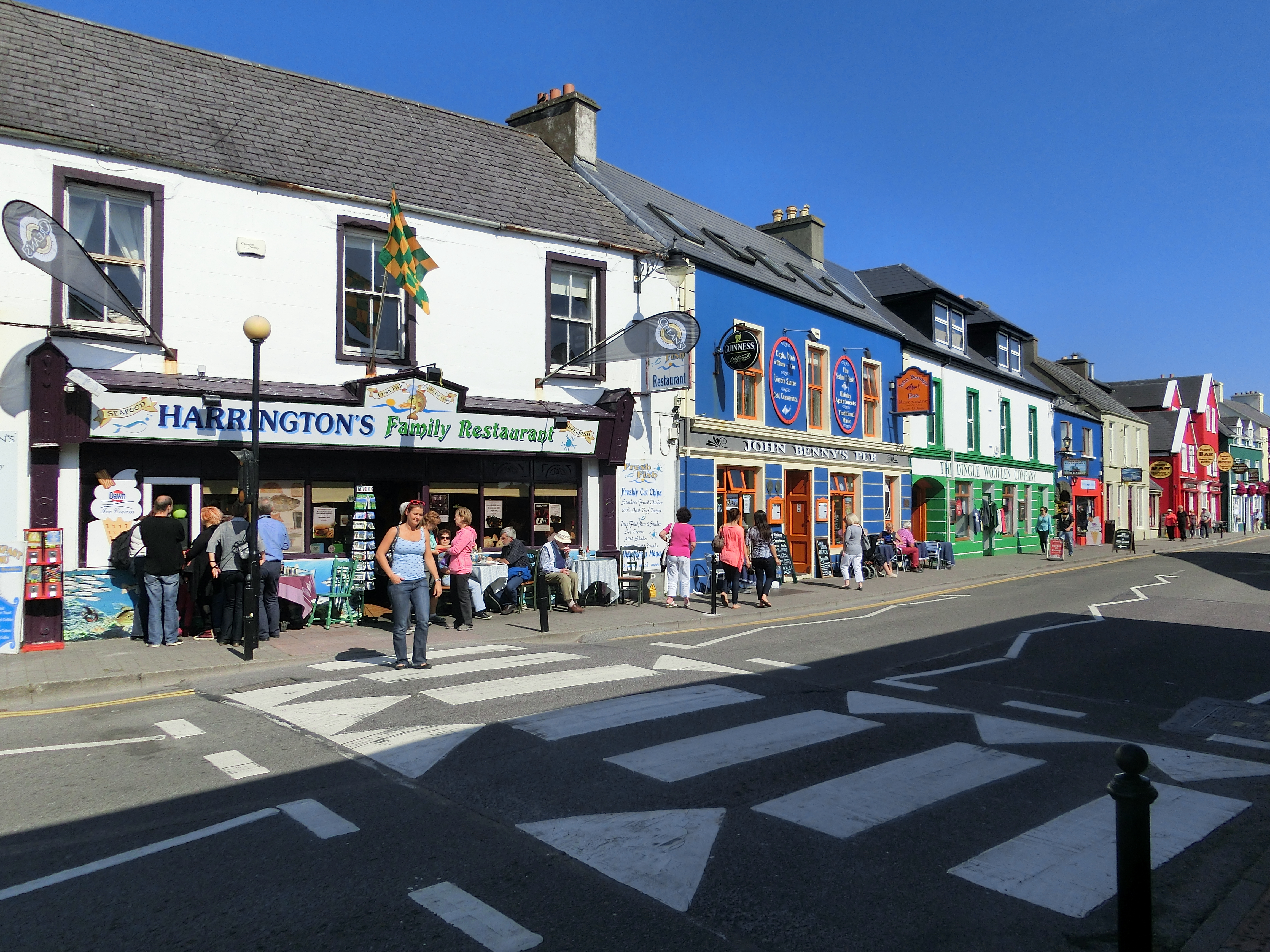 Mehrere Pubs umschließen den Parkplatz am Hafen von Dingle.
