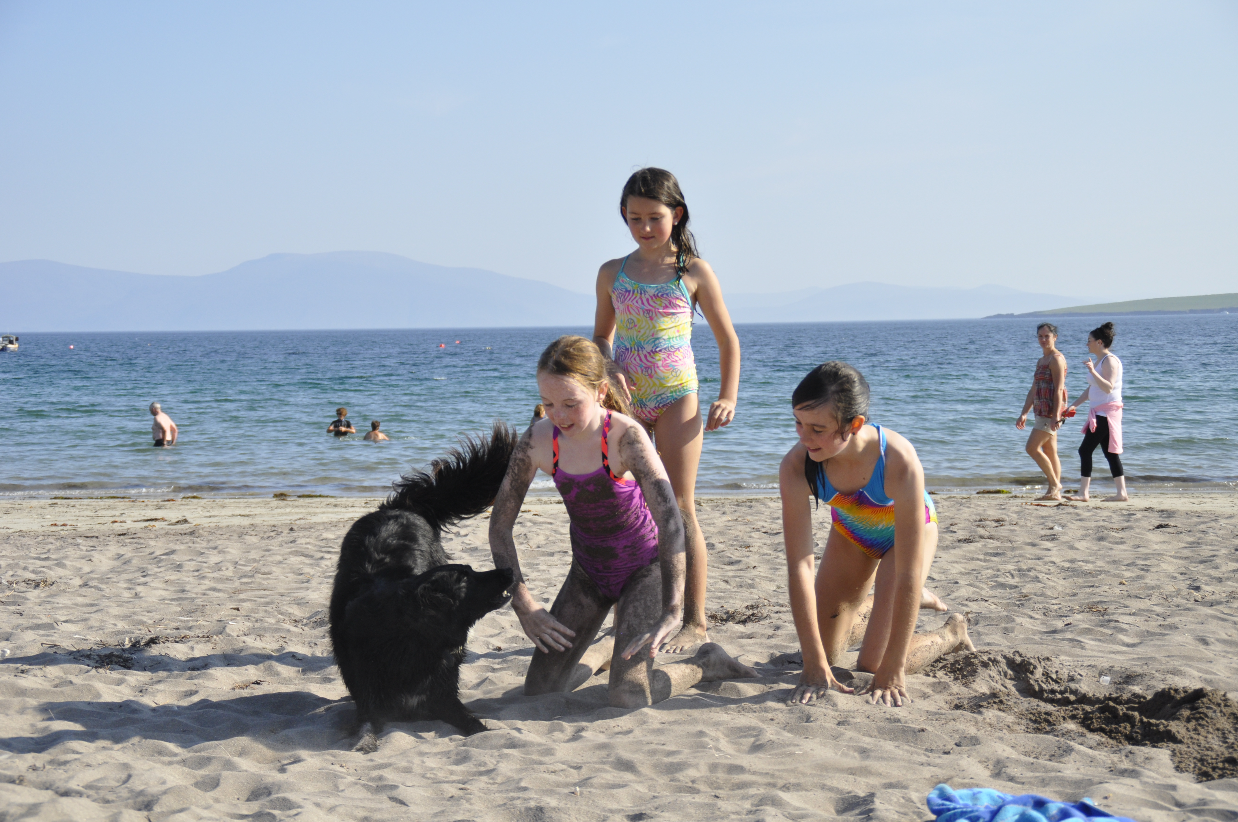 Aber ich amüsiere mich am Spiel der Kinder, die ihren Hund darauf abgerichtet haben, dass er ihnen Löcher in den Sand buddelt.