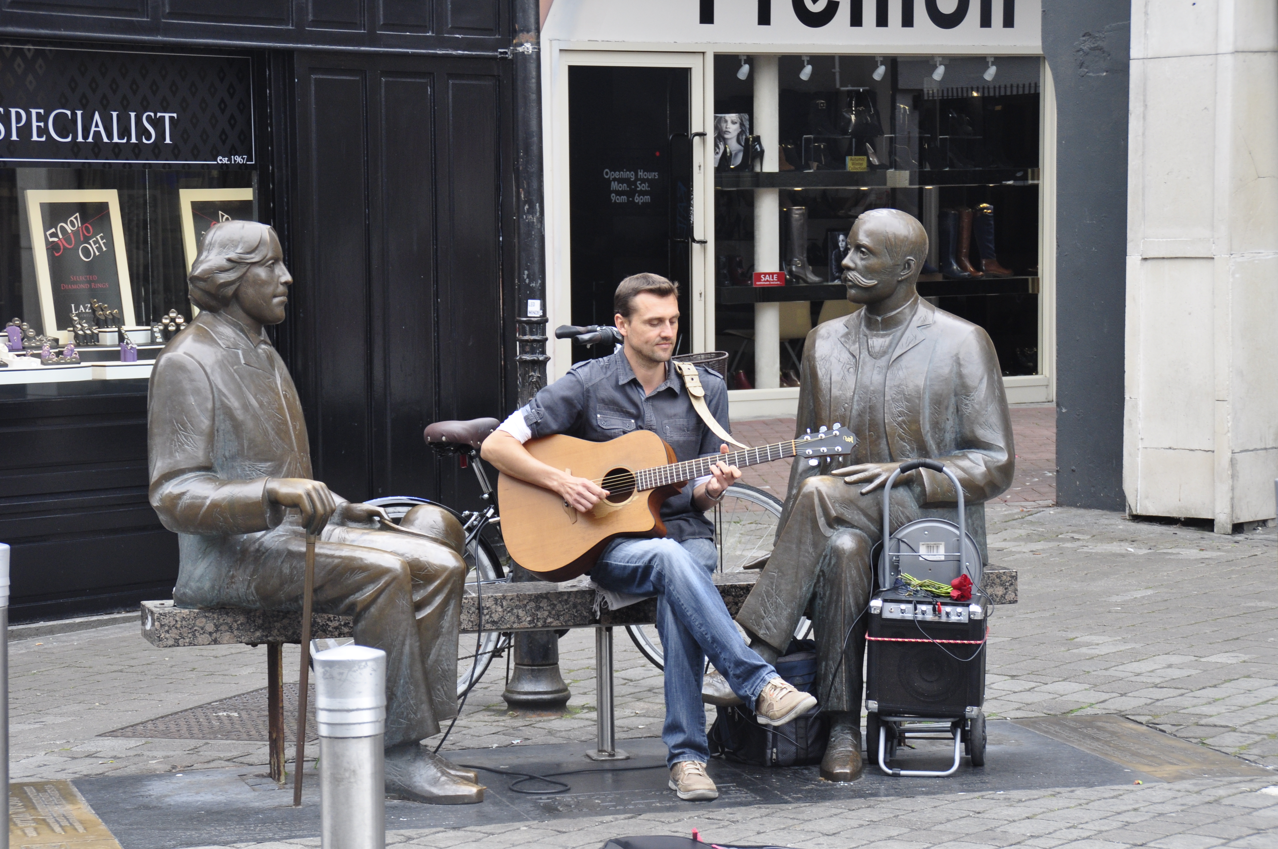 Zwischen dem großen irischen Schriftsteller Oscar Wilde und seinem Bruder hat ein Straßenmusikant Platz genommen.