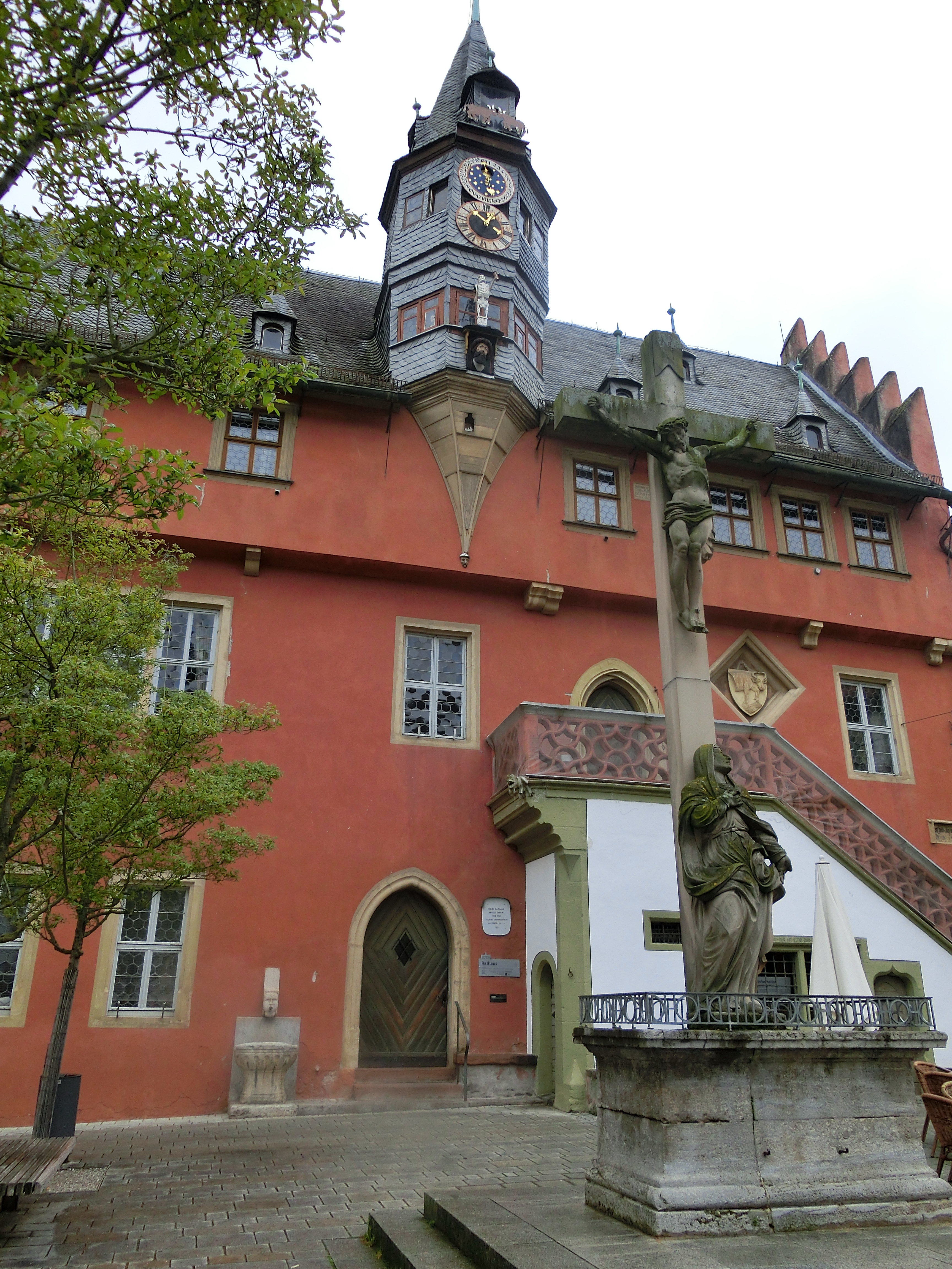 Das Rathaus des Städtchens ist natürlich im typischen „ochsenrot“ gestrichen.