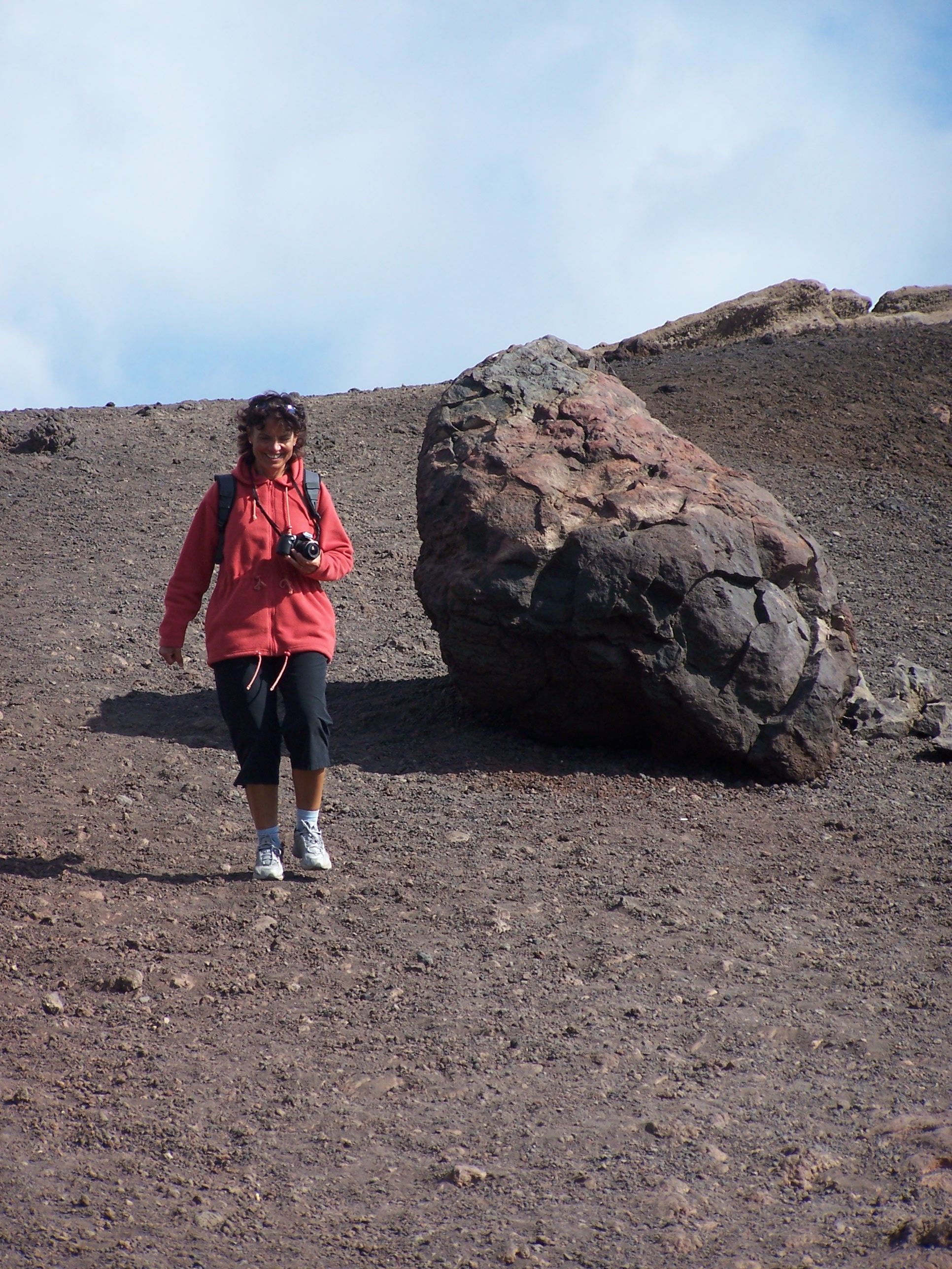 Abwärts wenden wir uns einigen der rostroten Nebenkratern zu und verstehen die Warnung vor der Gefährlichkeit des Vulkans, als wir an einer Bombe vorbeikommen, die wohl schon vor einiger Zeit von den bösen Geistern des Vulkans hier her gespuckt wurde.
