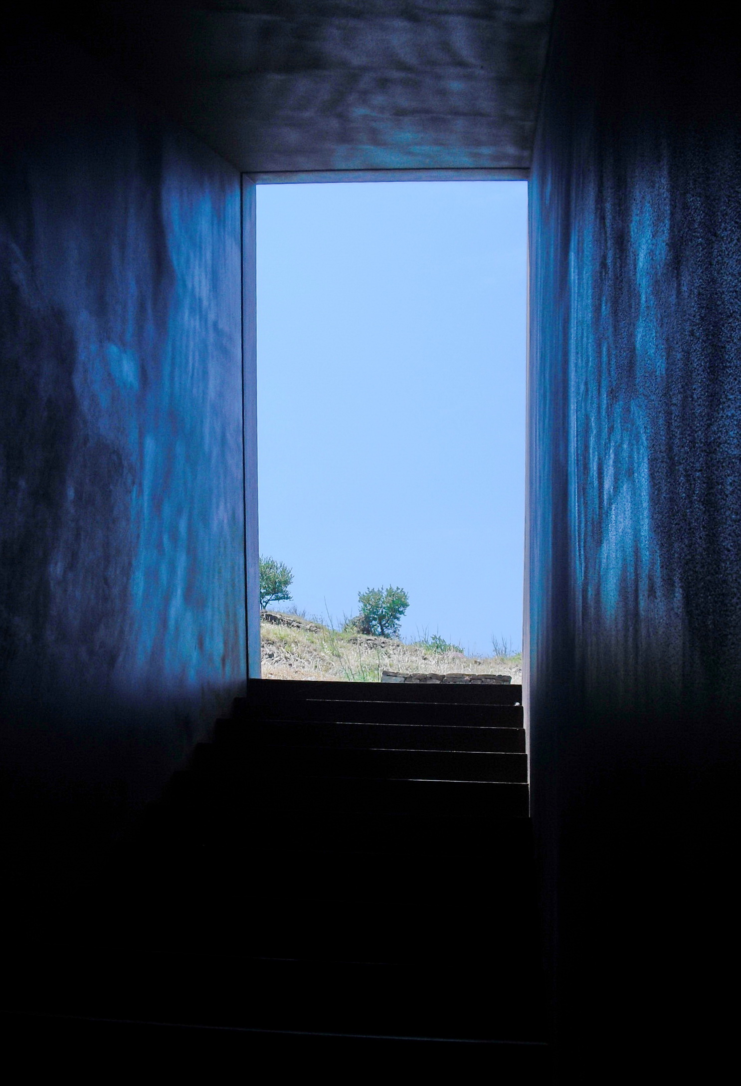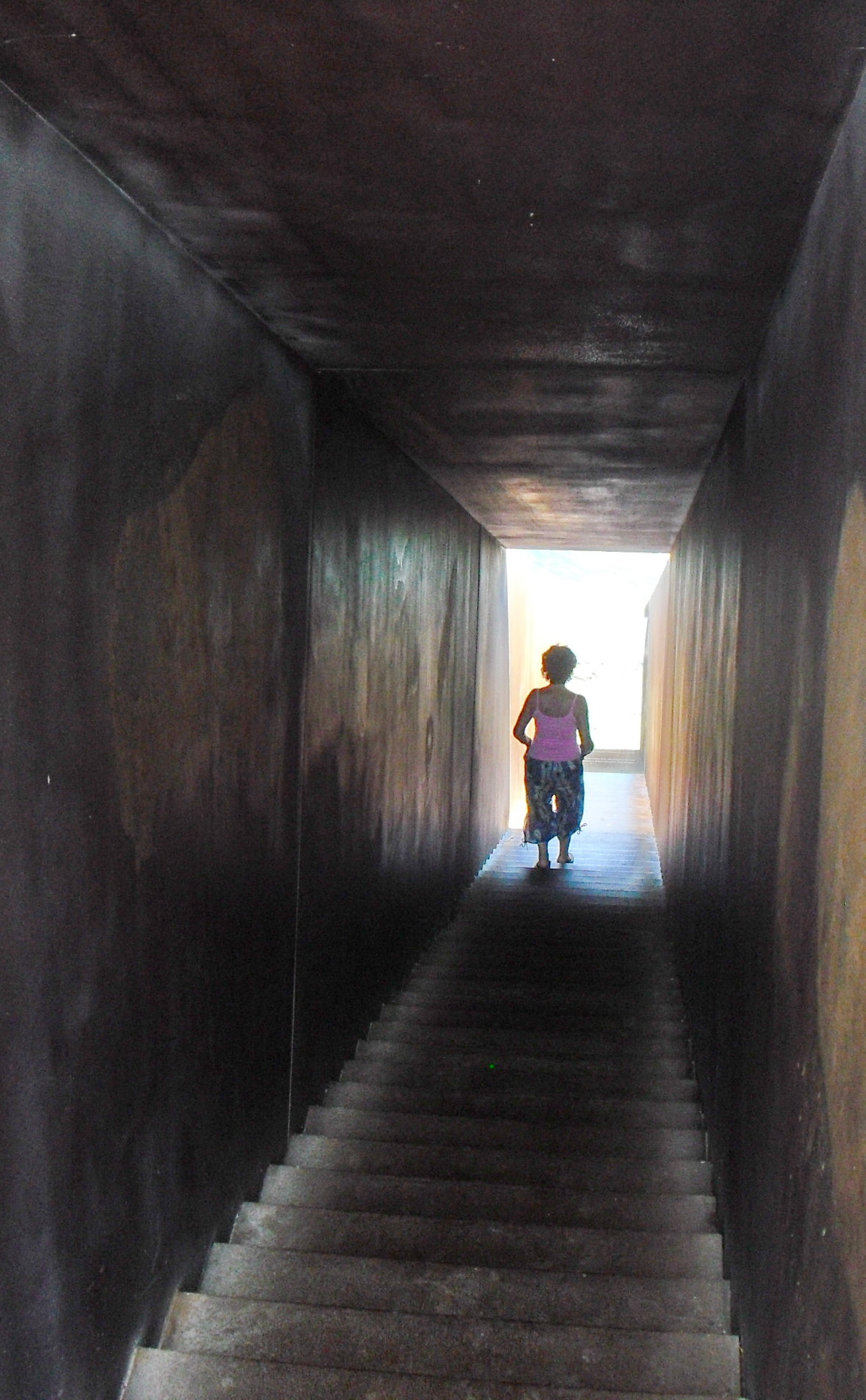 Auch wir betreten ohne lange nachzudenken den stahlrostigen Eingangstrichter und steigen die Stufen ins Dunkle hinab, an deren Ende uns der Absturz über die Klippen ins tieferliegende Meer sicher scheint, ist doch die abschließende Panzerglasscheibe erst im letzten Moment zu bemerken.