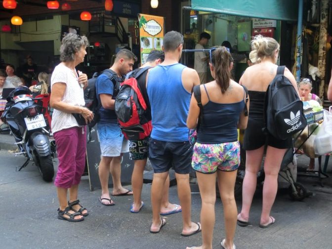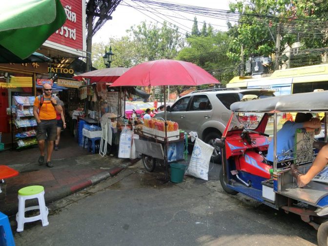 Die Khao San Road, ein Treffpunkt aller Bangkok-Reisenden, hat sich nicht mehr spezialisiert auf die Backpacker, die für ein paar Baht sich dort das Zimmer einer Herberge nehmen.
