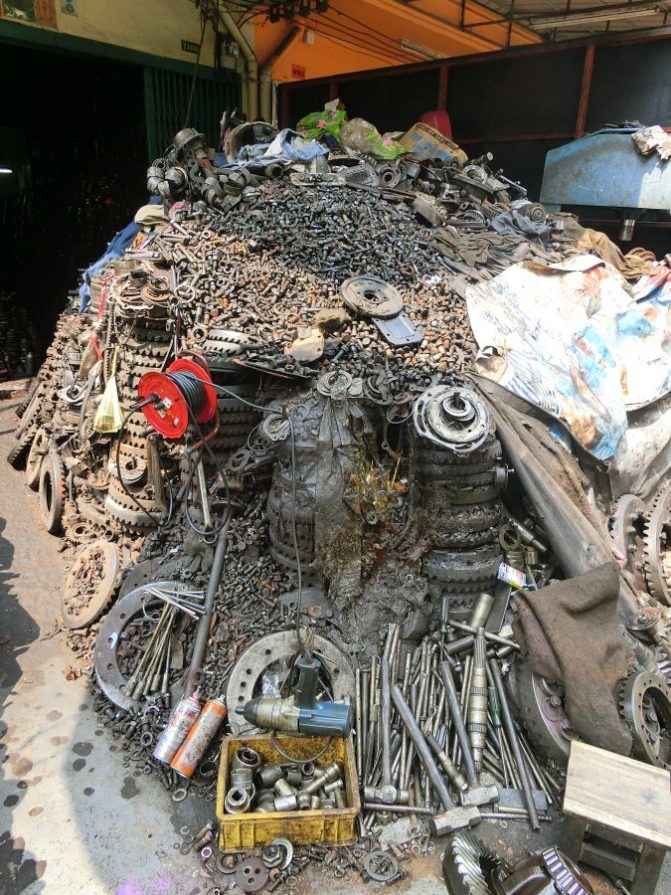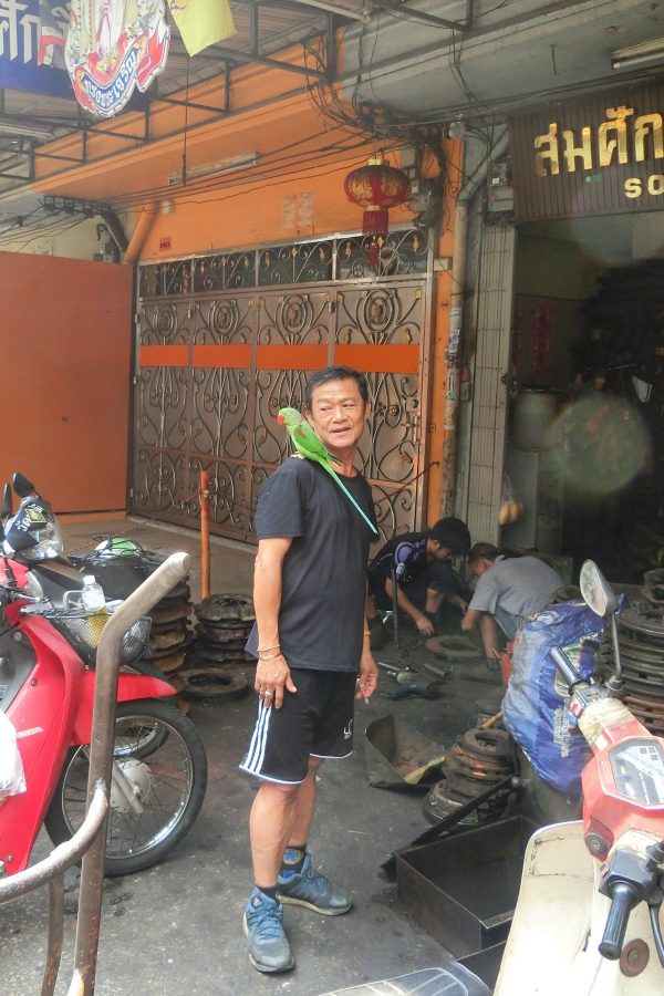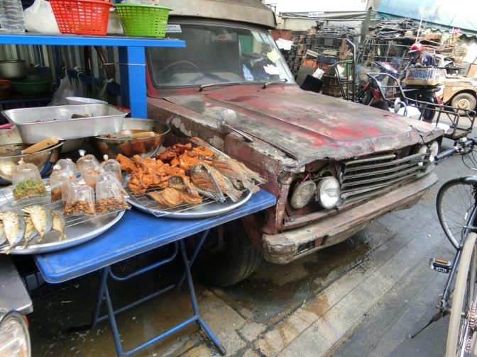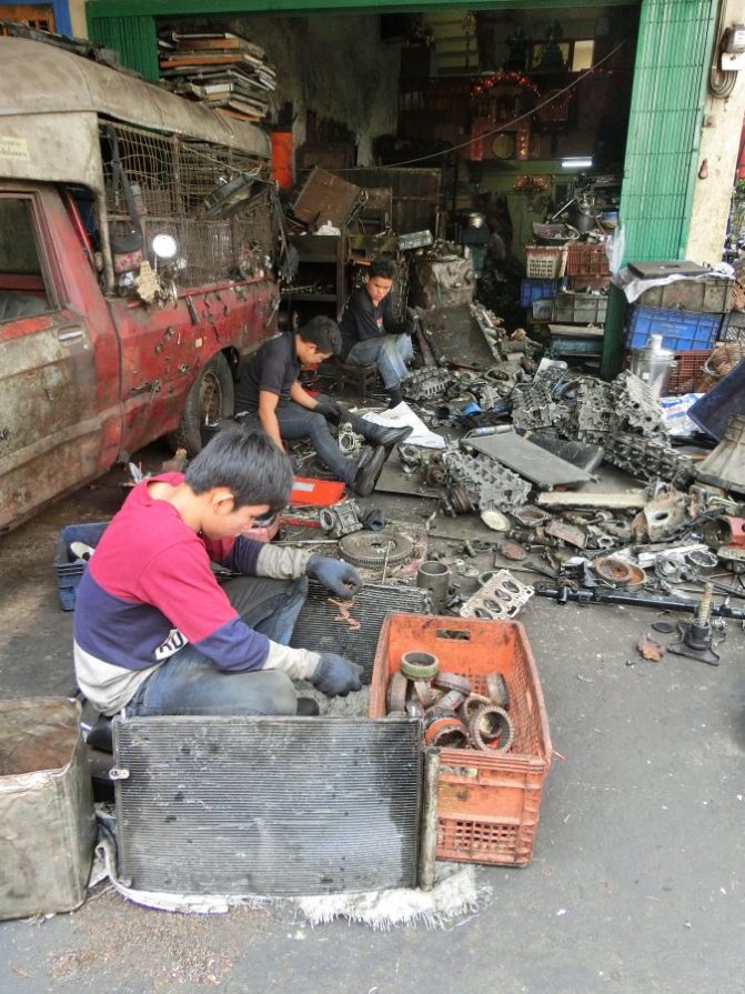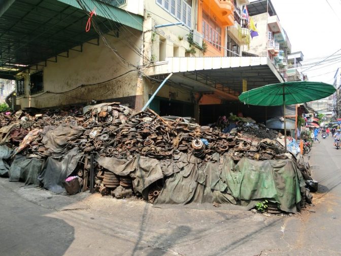 Wir steigen aus dem Wassertaxi an einer völlig unmöglichen Stelle aus – was gibts da schon zu sehen? – und pirschen uns fotoapparatbewaffnet durch die Autowerkstatt Bangkoks.