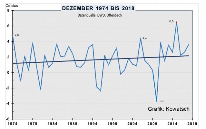 Schauen wir uns die Temperaturen im Dezember über einen noch größeren Zeitraum an, nämlich von 1909 bis 2018: